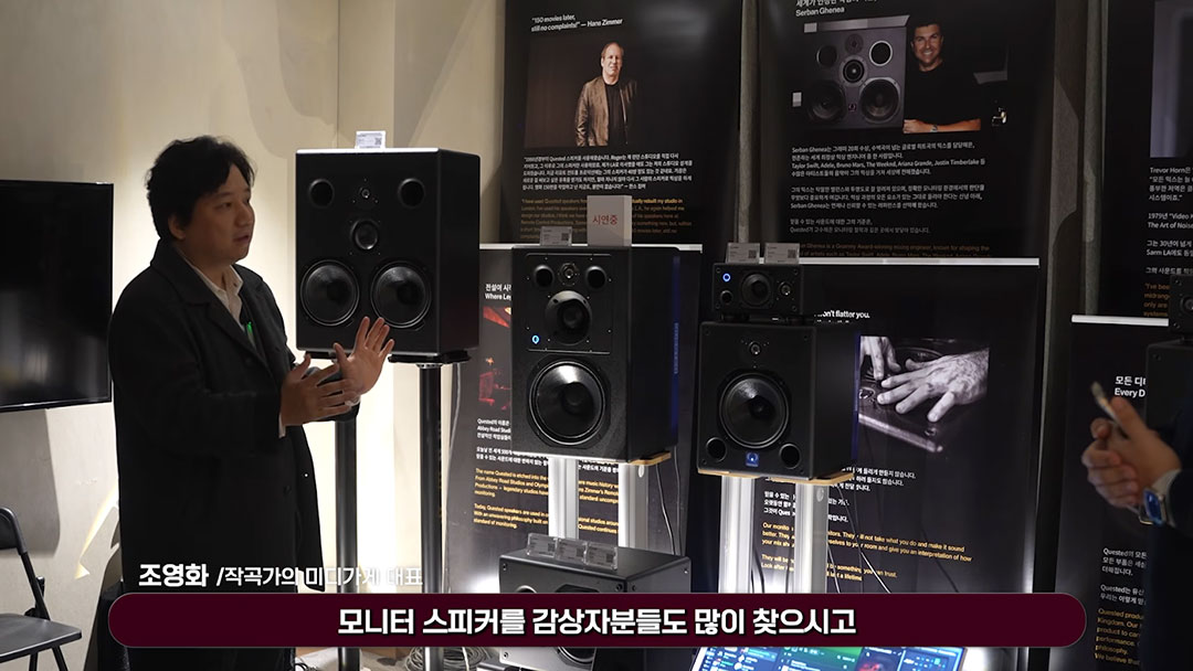 音频方面,对于房间“不太理想的声学条件(带有大量玻璃的非工程空间)”,Sabine的目标是1-10kHz的杜比全景声Premicr Studio:实现线性高声压级,同时避免音箱和玻璃的相互作用所导致的失真,需要调试QUESTED(罗杰之声)和ME Geithain 2个品牌的10个定制音箱型号:即全套系统动用总共45个音箱,其中37个双功放音箱(QUESTED)和8个带有网络音频的低音炮(其中4个为ME Geithain品牌)。
